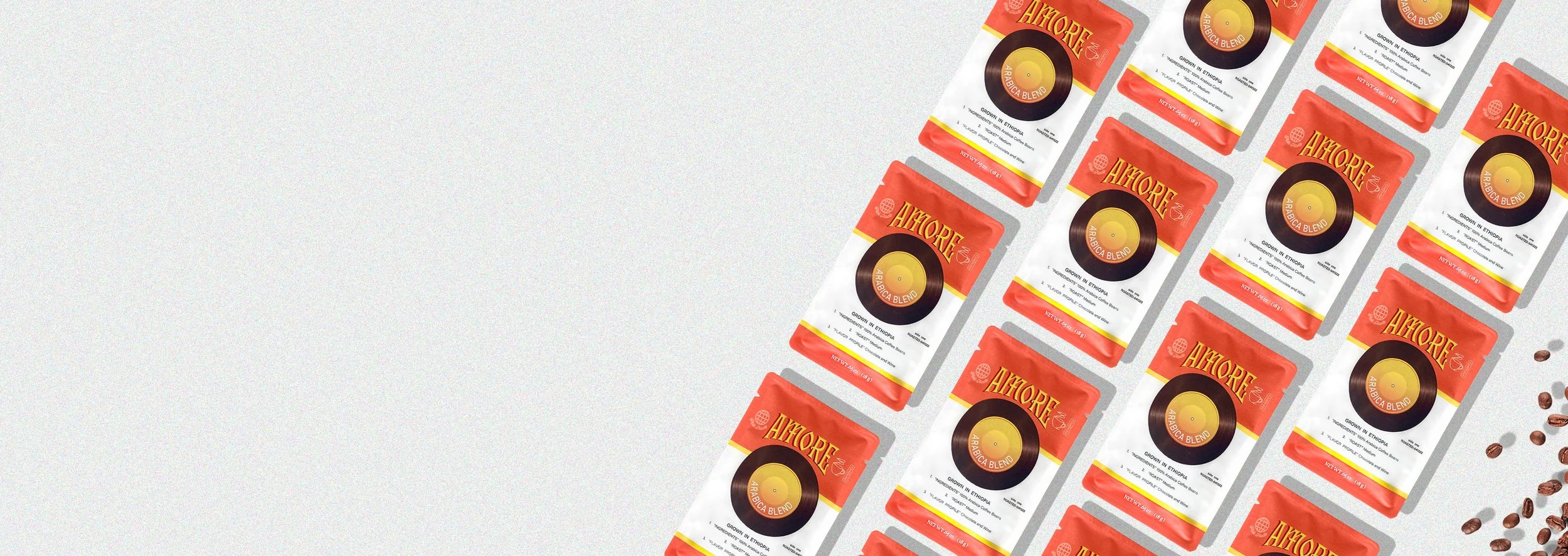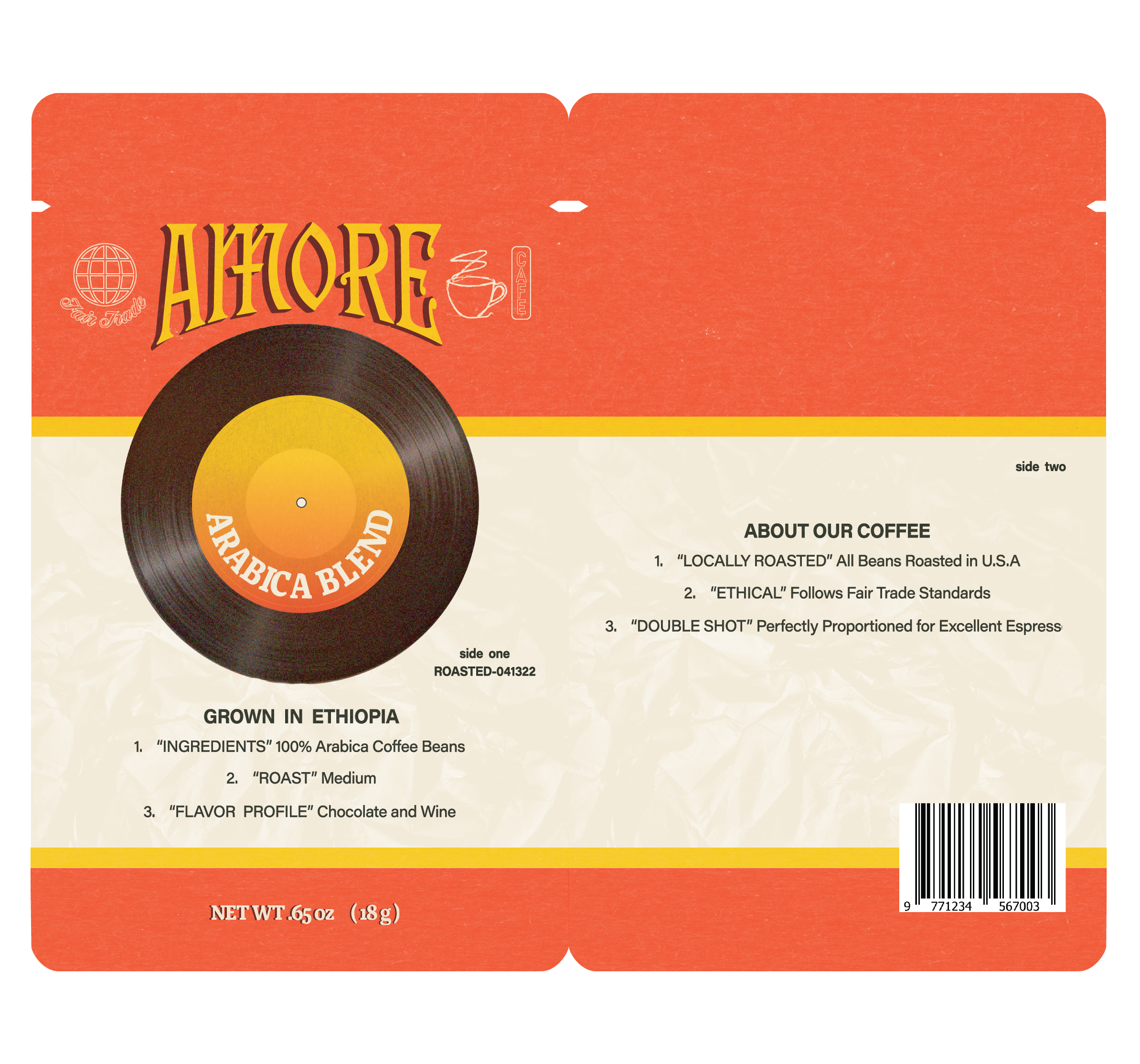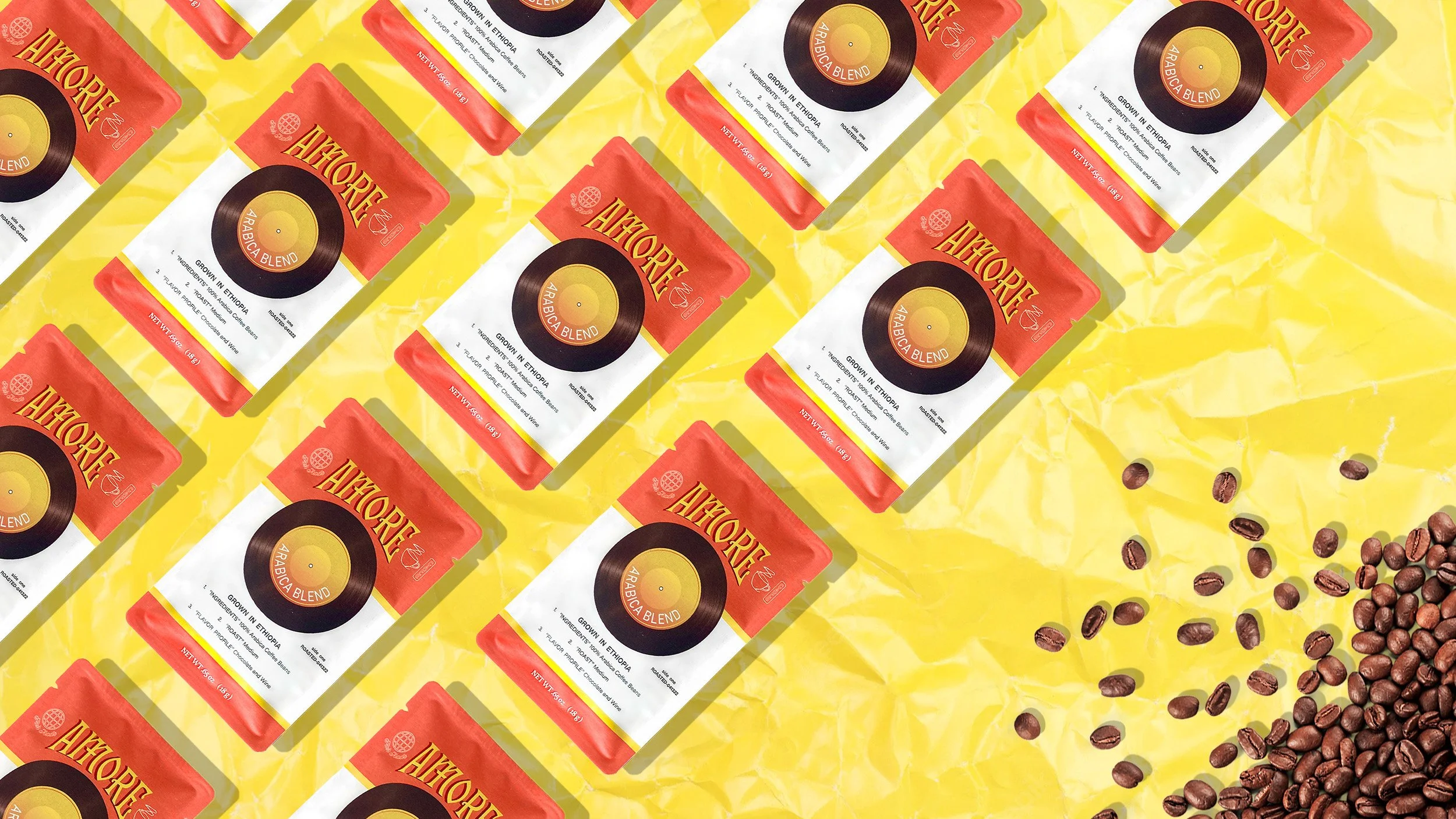 Inspired by the experience of selecting a record to play, the design presents shoppers with a choice between several flavors to start their day with. With typography and layout inspired by vintage record design, the label describes the taste and origin of the roast.