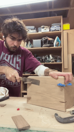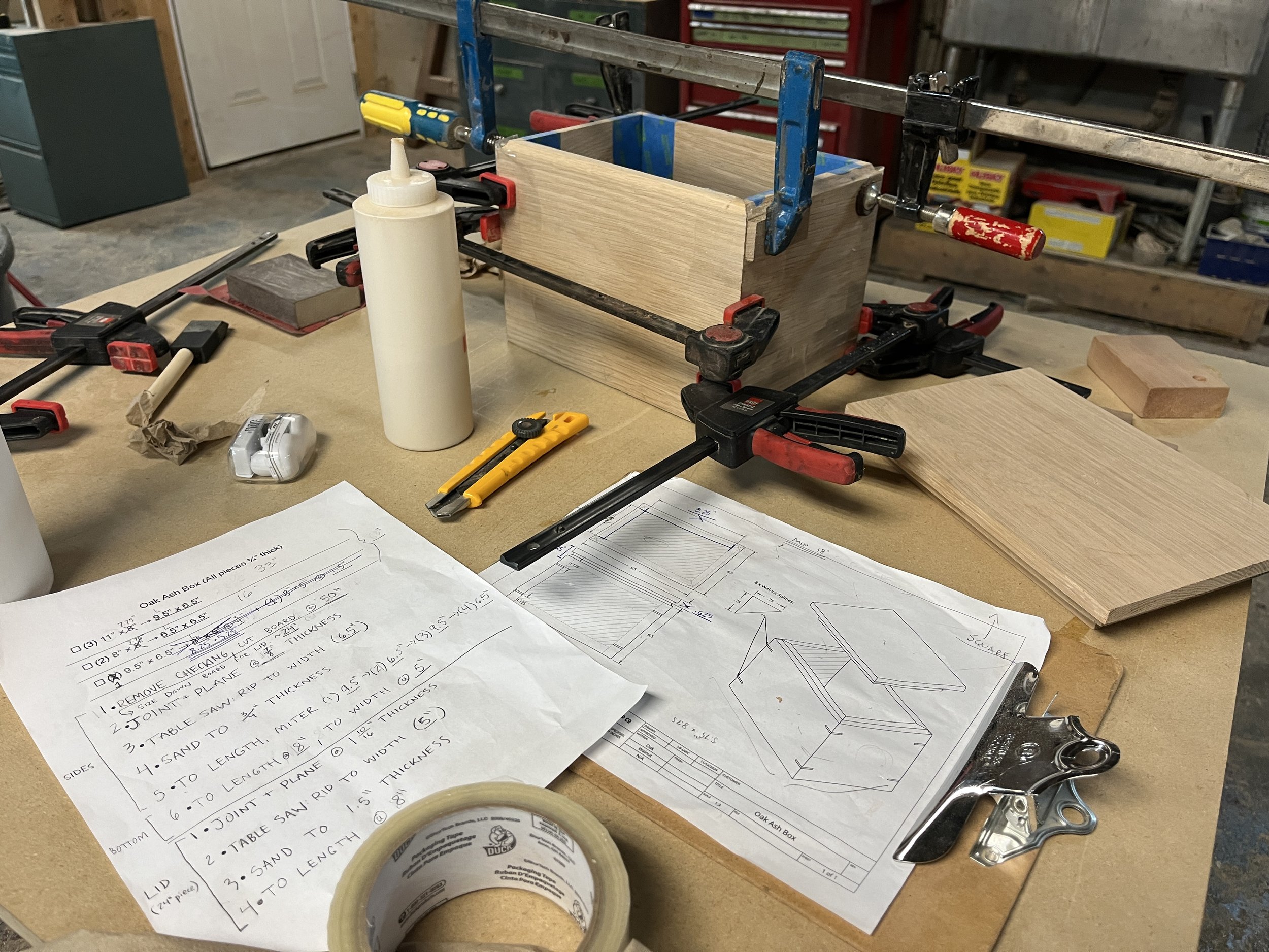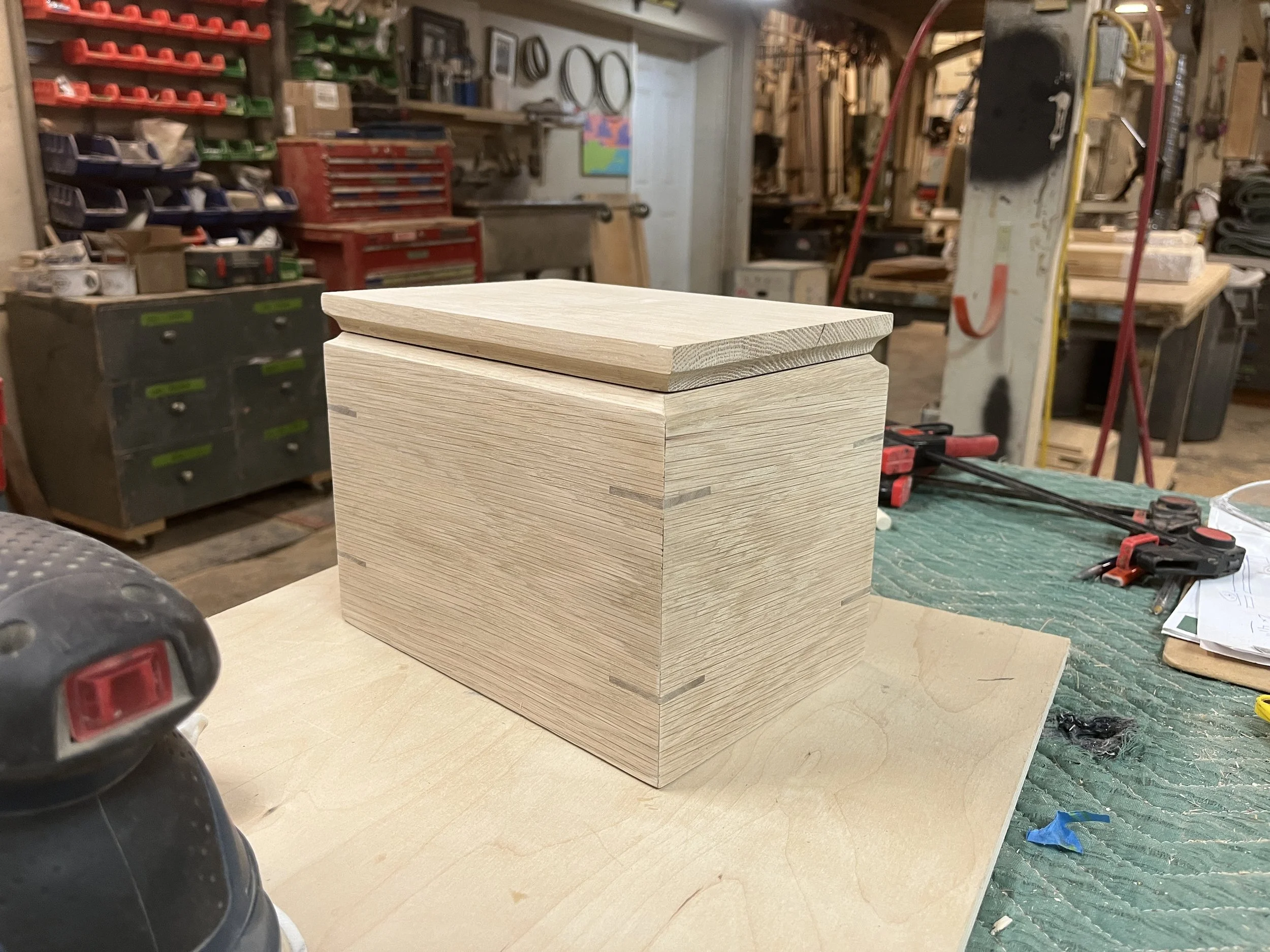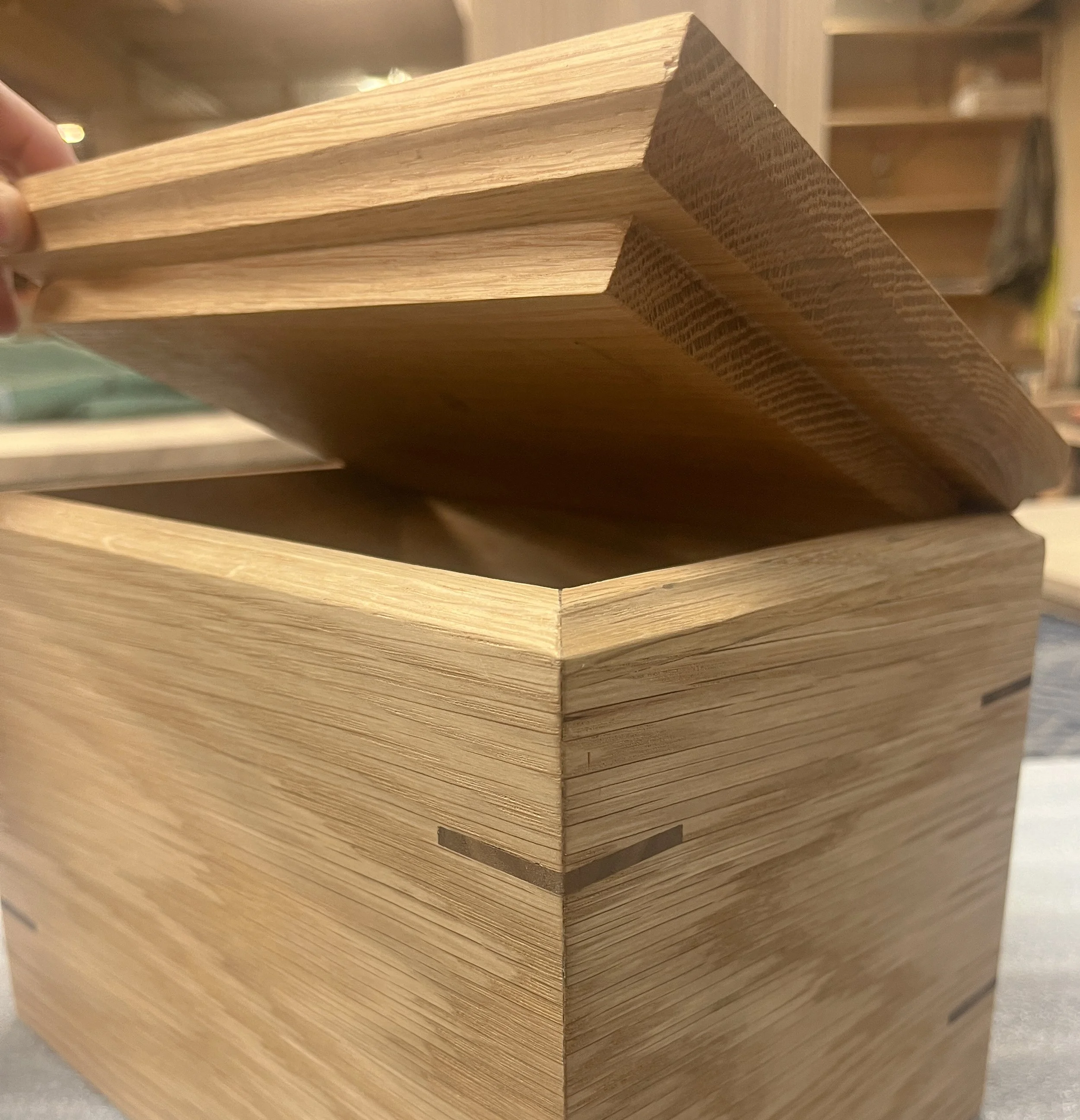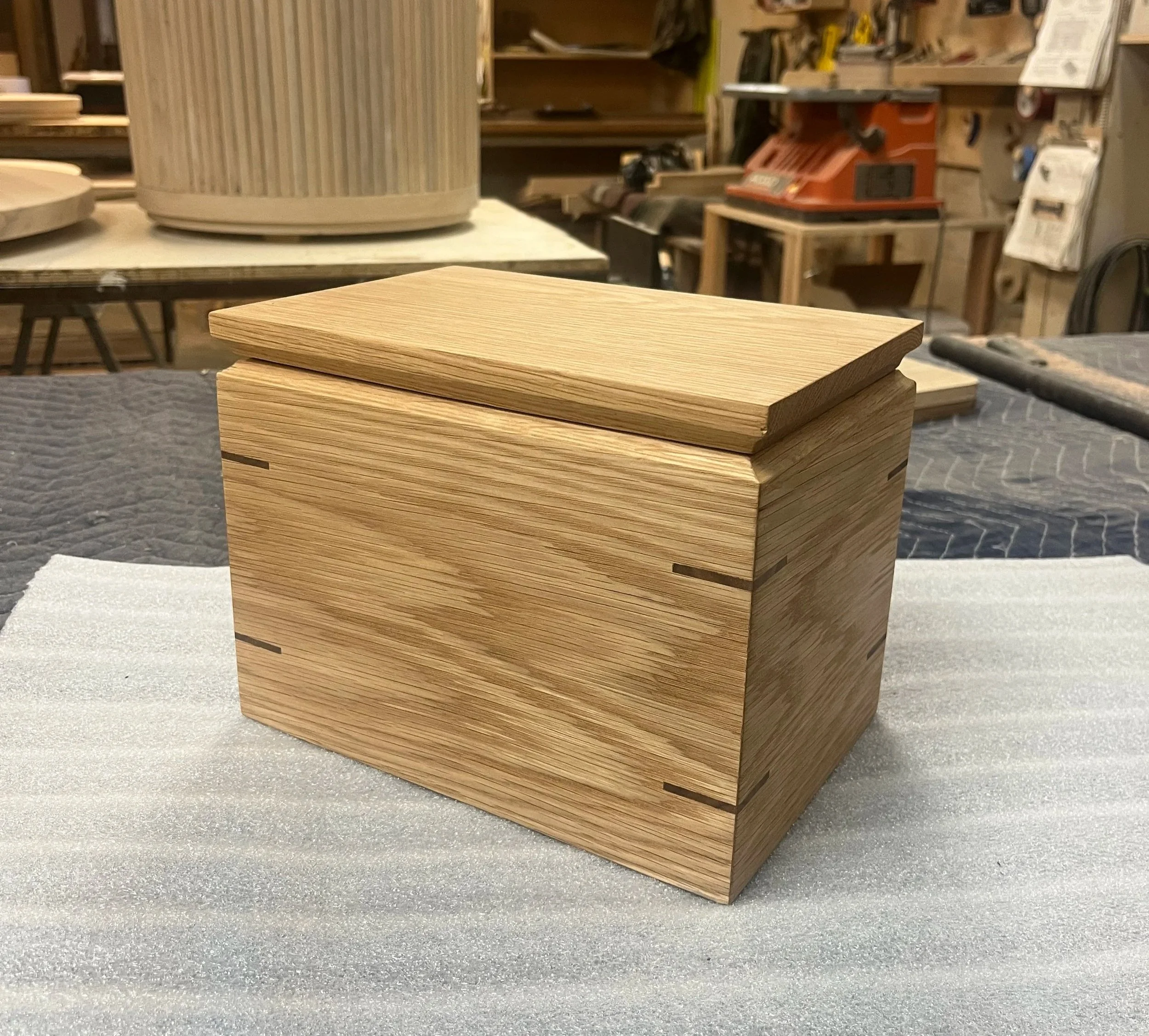 Built to hold that ashes of a loved one, this oak box with simple design with continuous grain around the box and walnut splines for contrast. The friction fit lid with thumb grooves were added for an easy to open and secure container.